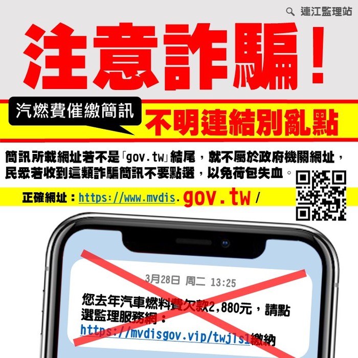 二、經查簡訊網址「https://mvdis-gov.vip/twjls1 (不斷更新)」不是「gov.tw」結尾,不屬於政府機關網址是詐騙訊息。本站隨即發佈新聞稿澄清,提醒民眾若收到這類詐騙簡訊,不要點選,並提供監理服務網正確網址。民眾若收到繳費簡訊存有疑義,請洽連江監理站查證。