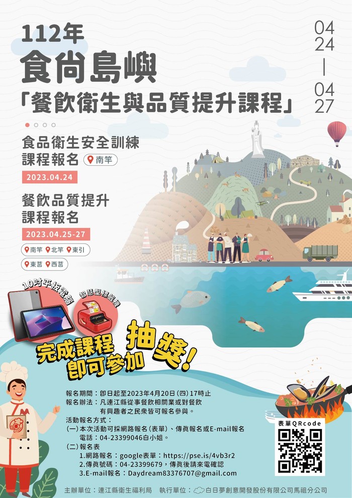連江縣衛生福利局於4/24~4/27辦理「餐飲業食品衛生安全訓練課程」與「餐飲品質提升課程」,為鼓勵餐飲業者與對餐飲有興趣者之民眾參與課程,加碼抽獎活動,參與課程並完成就有機會獲得平版電腦或智能型標籤機等獎項喔!