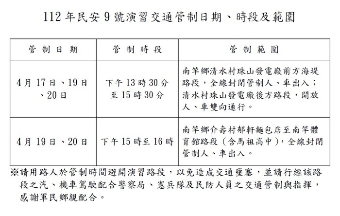 縣警局提醒,預演及正式演習期間將管制所有非演習人員、車輛進入清水村珠山發電廠前方路段及介壽村郁軒麵包店至介壽村室內體育館路段,相關交通管制時間及路段如下: