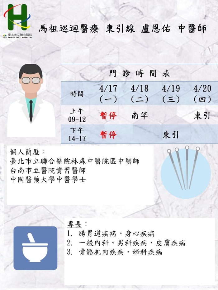 4/17(一) 下午 南竿縣立醫院,暫停看診。