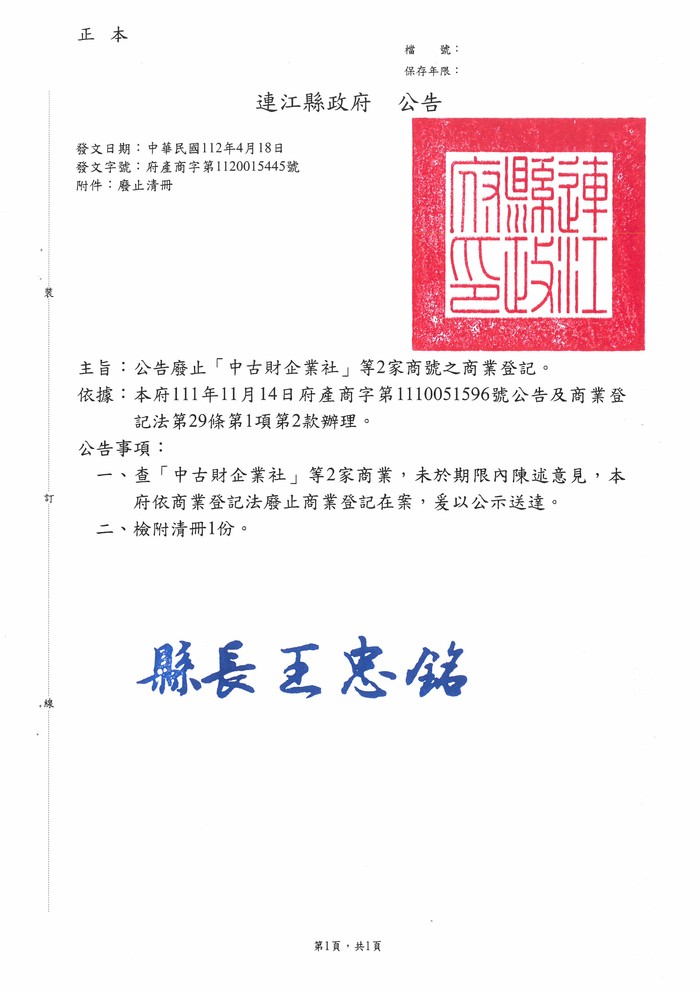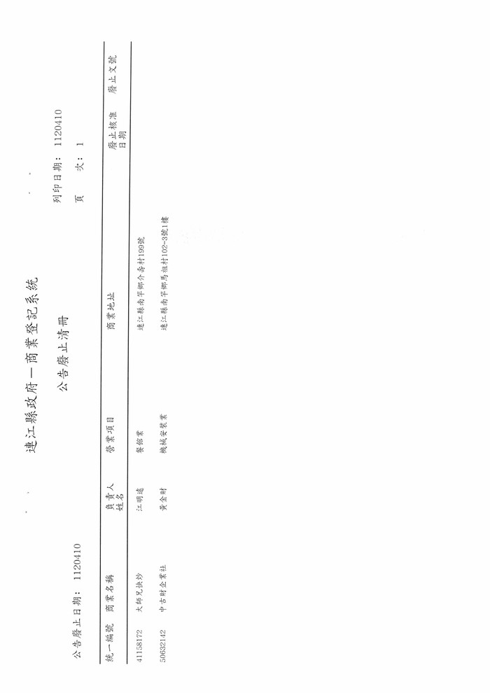 公告廢止中古財企業社等2家商業登記