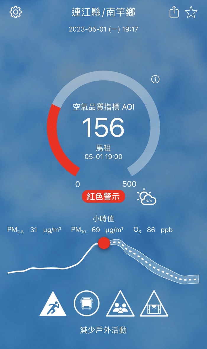下午19時空氣品質監測結果,馬祖地區受境外污染物影響,空氣品質指標AQI為156,對所有族群不健康。另外,本縣設有PM2.5微型感測器,若民眾想了解周遭空氣品質,可至以下位址查詢。