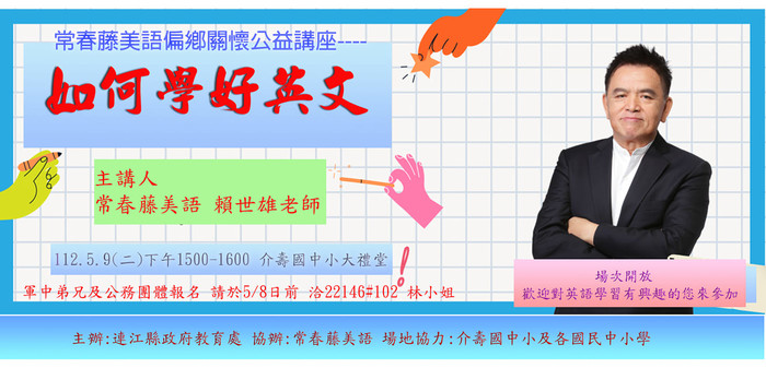 【記者吳嘉榮報導】為提升本縣英語教學成效,建立師生英語學習的新思維,縣府教育處9日下午3時於介壽國中小大禮堂辦理常春藤美語偏鄉關懷公益講座,邀請常春藤美語老師賴世雄主講如何學好英文,歡迎軍中弟兄及公務團體踴躍參加,報名請於8日前電洽(0836)22146轉102林小姐。