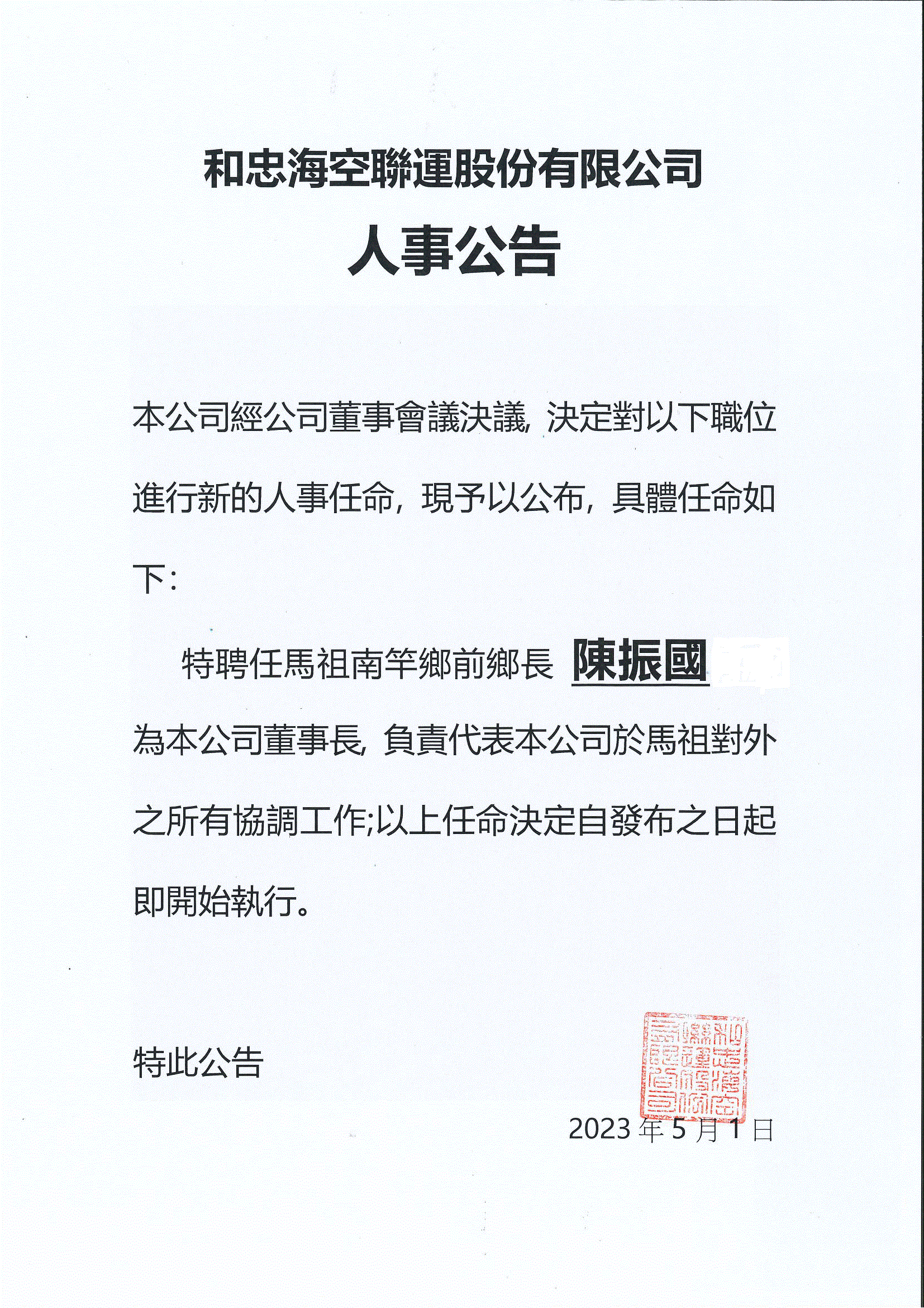 先生為本公司董事長,負責代表本公司於馬祖對外之所有協調工作;以上任命定自發佈之日起即開始執行。