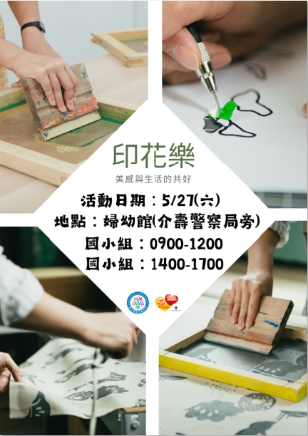 印花樂-體驗美感與共好生活 --閱讀人次 : 882 本活動辦理目的是帶領婦幼進行文化活動體驗及宣導國際兒童公約四大基本公約、消除性別刻板印象、偏見與歧視。本次活動融入環境永續議題,課程中將分享生活中的印花從何而來,介紹兩位兩性印花藝術家們的作品,來傳達作品中對兩性對美的追求與性平議題,最後帶領大家進行絹印體驗,除了從中提倡節省資源不要輕言浪費的重要性外,在國高中生場次中將帶領大家學習『型染印花』,藉由講師引導學員如何將在地元素轉換成印花並設計出屬於自己特別的作品。