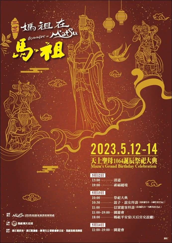 農曆三二三,媽祖在馬祖 --閱讀人次 : 959 馬祖境天后宮於本月5/12、5/13、5/14日舉行天上聖母1064誕辰祭祀大典。今年遶境活動於境內祈安後,將於天后宮廣場由馬防部龍隊、中正國中小醒獅團、馬祖陣頭協會等帶來精彩演出,歡迎大小朋友一起參與,共沐娘娘神恩