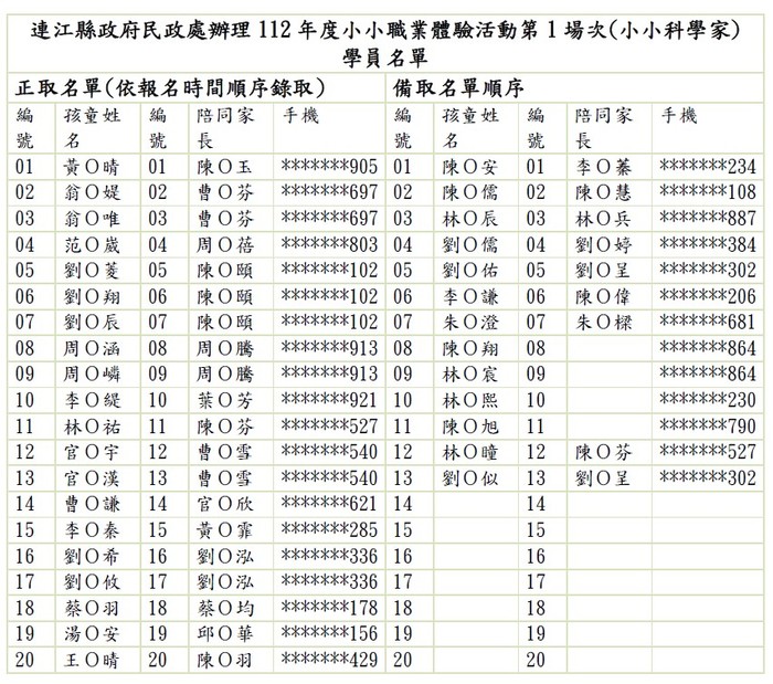 民政處辦理小小科學家職業體驗正取名單 --閱讀人次 : 1276 感謝親子們報名本活動,正取及備取名單依【報名時間順序】及【符合招募對象年齡】排列。