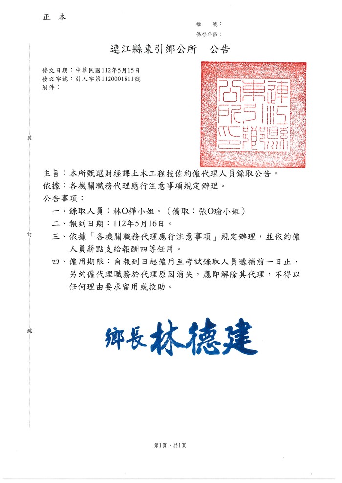 東引鄉公所徵選財經課土木工程技佐約僱代理人員 錄取公告