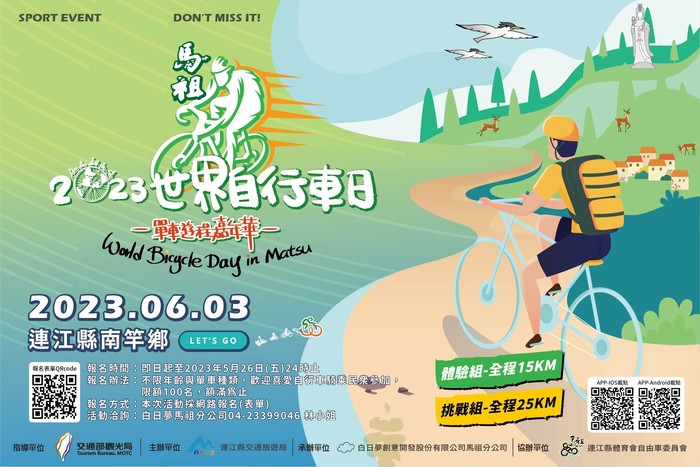 2023世界自行車單車遊程嘉年華南竿場 --閱讀人次 : 8144 響應聯合國訂定6月3日為世界自行車日,同時迎接疫後的觀光復甦,由交通部觀光局指導與連江縣交通旅遊局共同主辦「2023世界自行車日-單車遊程嘉年華-南竿場」,騎經馬祖福澳港、最北星巴克、珠螺勝利堡、馬港地質公園、媽祖巨神像、雲台山等特色景點,路線單程體驗型路線約15公里、挑戰型路線約25公里,悠悠騎乘在馬祖的自然風情裡,蜿蜒崎嶇的路具有挑戰力,來征服這大自然給的挑戰,在夏季開始前抓住藍眼淚的尾巴,感受馬祖怡然自得的生活,讓馬祖成為台灣最美麗最具有挑戰性的自行車路線,配合自行車APP,由全臺參與者團結騎行創造紀錄,藉此傳達「綠色、永續、低碳」的精神,提升台灣國際觀光形象,邀請馬祖民眾喜愛運動、自行車愛好者共襄盛舉共同參與此場活動!