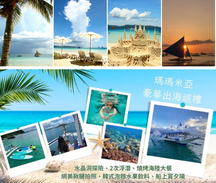 特別安排『瑪瑪米亞豪華出海遊升級版』包含水晶洞探險、2次浮潛、燒烤海陸大餐、網美鞦韆拍照、韓式泡麵、欣賞夕陽(贈韓國保濕面膜)。