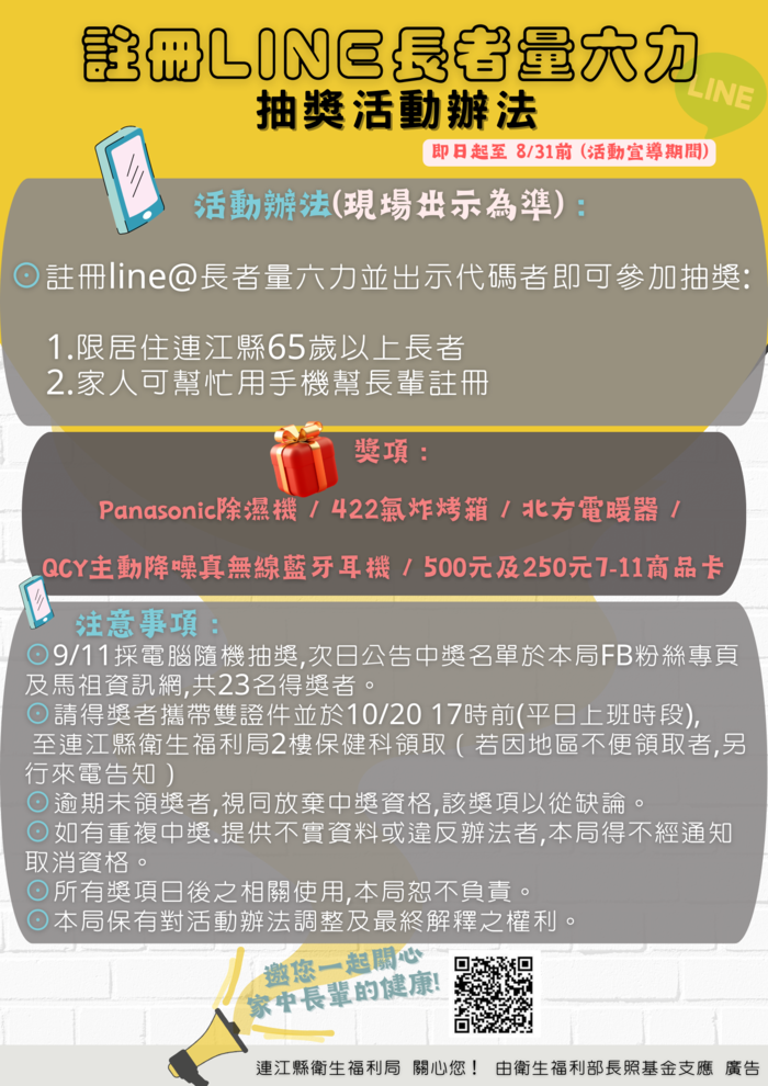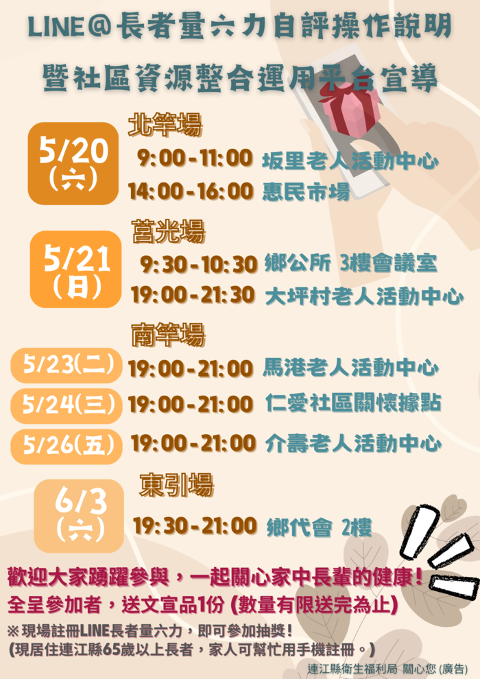 *現場出示註冊line長者量六力之代碼,即可參加抽獎 ( 限居住連江 縣65歲以上長者,家人可幫忙用手機註冊。)