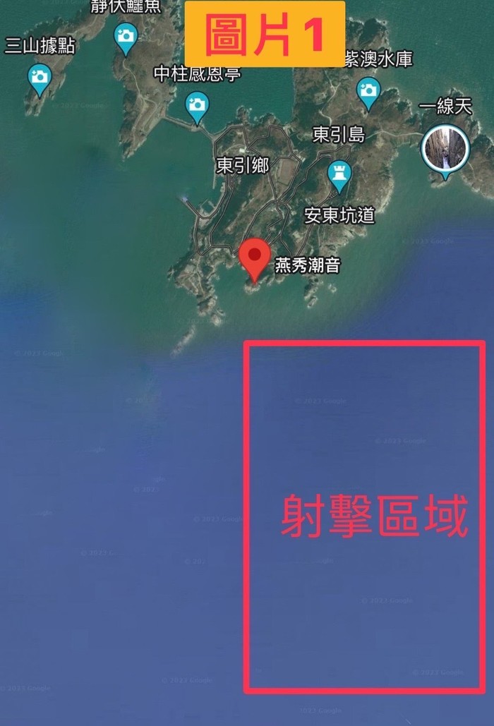 東引指揮部5/24演實彈射擊訓練公告 --閱讀人次 : 659 各位鄉親大家好,因應中共敵情威脅,為強化官兵突發狀況處置,東引指揮部規劃於5月24日「上午0830時至0900時」於圖上射擊區域(燕秀海域)實施忠義操演實彈射擊訓練,請周遭船隻、航空器及釣客避免進入射擊區域(如圖1);另避免影響民眾人身安全,以下時間、地點及路段實施進出管制: