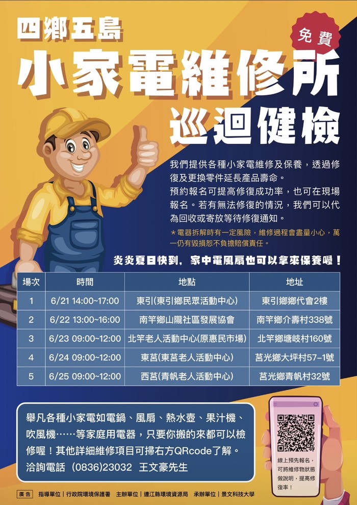 端午連假環資局將邀請萬華「一碼」空間「小家電維修所」團隊來到連江地區進行四鄉五島小家電維修及服務,活動包含了有小家電健檢簡易維修、保養及互動,順便教導民眾排除家電的簡易故障問題,大大省下荷包。預約報名可提高修復成功率,也可在現場報名,若有無法修復的情況,主辦單位可以代為回收或寄放等待修復通知。