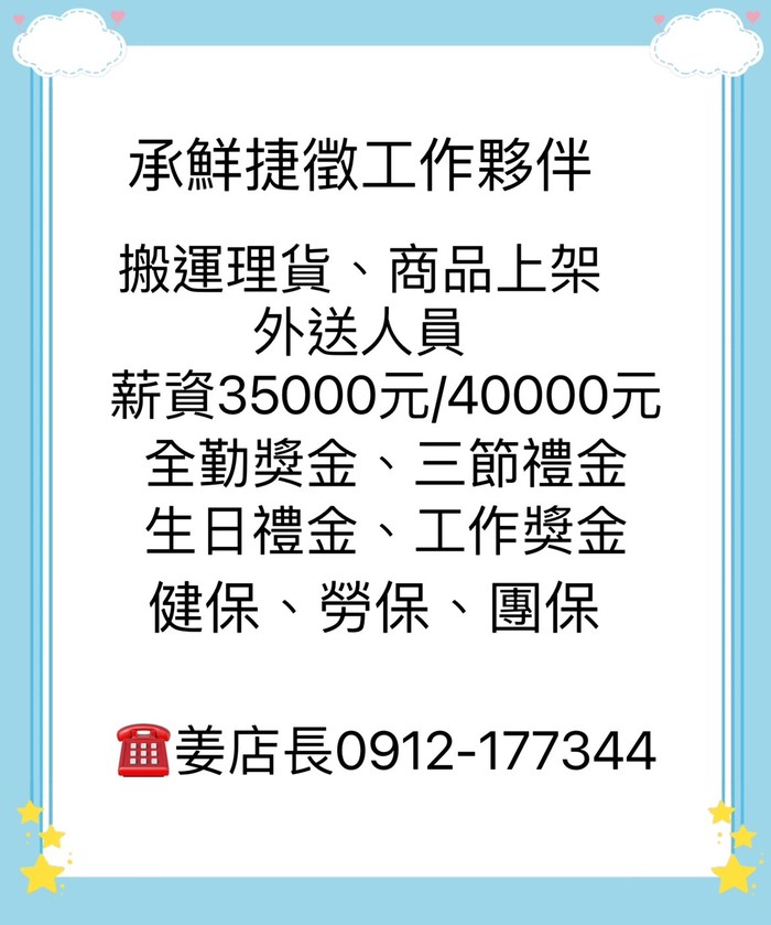 承鮮捷購物商場~誠徵理貨上架、外送人員