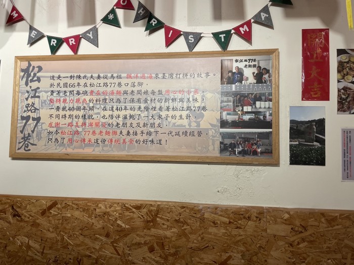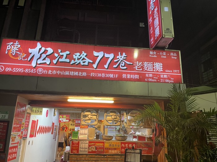 在民國66年,一對來自馬祖北竿的夫妻跨海來台,落腳在台北市松江路77巷,老闆賣麵,老闆娘自製小菜,胼手胝足一路打拼,不僅養活了一大家子,也有了今天的格局。