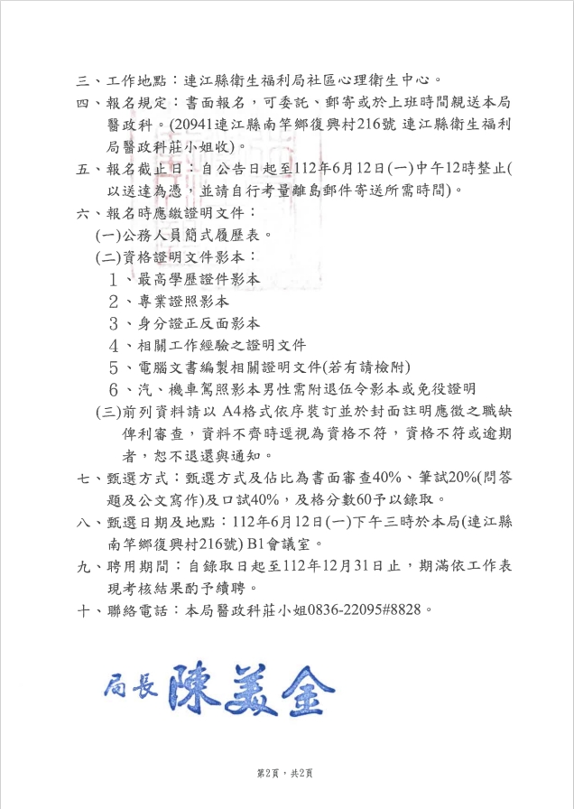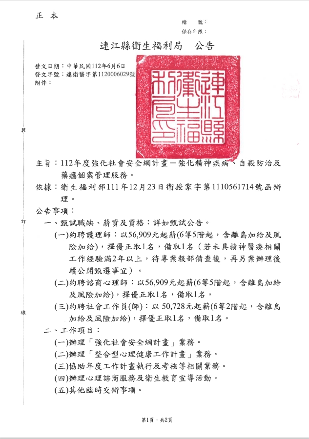 衛福局誠徵112年社會安全網約聘護理師、心理師、社工員(師)
