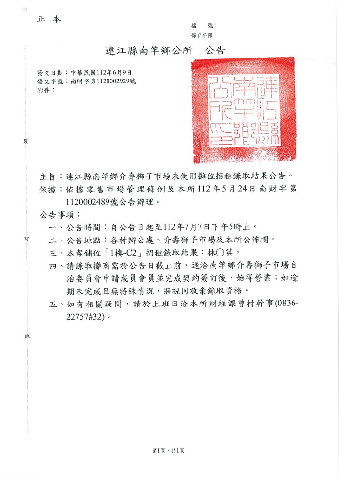 南竿介壽獅子市場攤位招租錄取結果公告