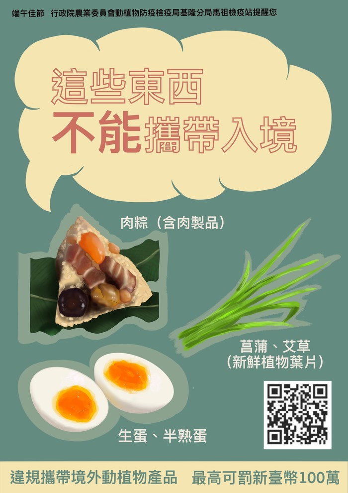 勿自中國大陸攜帶肉粽、菖蒲、艾草、生花生、生鮮粽葉、生蛋與半熟蛋等動植物產品入境,違者最高可處新台幣100萬元罰鍰
