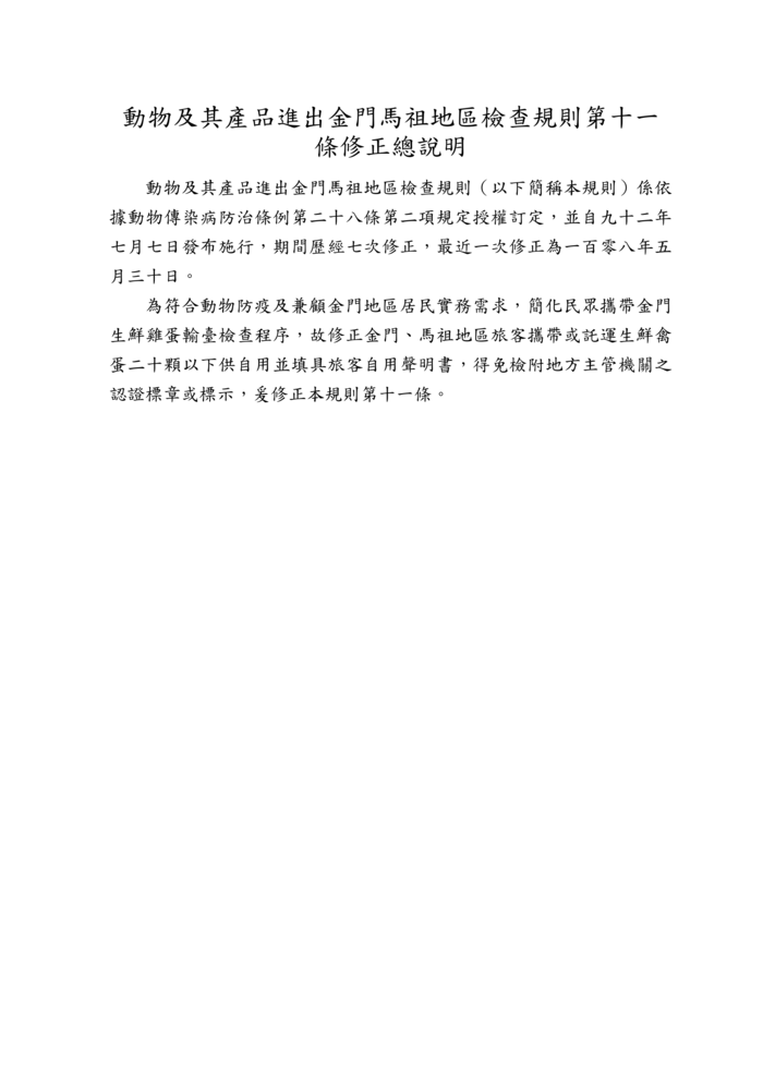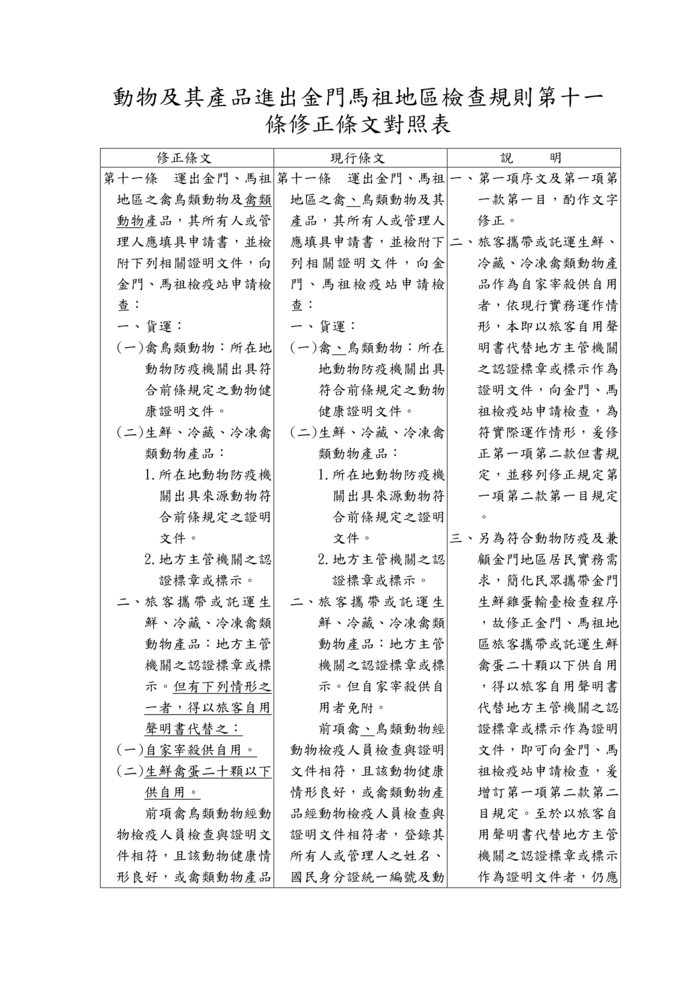 依據行政院農業委員會 112 年 6 月 12 日農防字第 112147499A 號令修正「動物及其產品進出金門馬祖地區檢查規則」第十一條修正內容,鄉親或旅客攜帶生鮮蛋品自馬祖地區前往臺灣本島,20顆(含)以內填寫自用申請書即可,超過 20顆需取得產業發展處開立證明書,倘無證明書超過20顆的部分將予以退運。