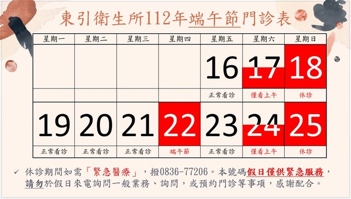 東引衛生所「端午節」門診時段公告