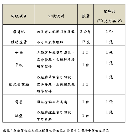 6/26北竿鄉「行動資源回收站」宣導 --閱讀人次 : 662 環資局為加強推廣基層資源回收、共創循環經濟效益,委託技佳工程科技公司人員辦理北竿、東莒及東引三島行動資收站宣導活動,行動資收站活動分2階段進行,第一階段為行動資收做環保,民眾攜帶重點項目資收物回收工作(廢電池、照明燈管、手機、平板、筆記型電腦、電扇或鍵盤),符合下表其中一項重點項目資收物回收工作給予等值宣導品(每人每場限領1次宣導品) 或提供家中乾淨且完整的紙袋或任意型式的提袋30個,符合第一階段回收工作之民眾,方可進行第二階段互動式小遊戲「『鐵』定好玩垃圾分三類等您來挑戰,希望藉著不斷的宣導,讓民眾養成良好的環保觀念,為我們居住的環境盡一份力量。