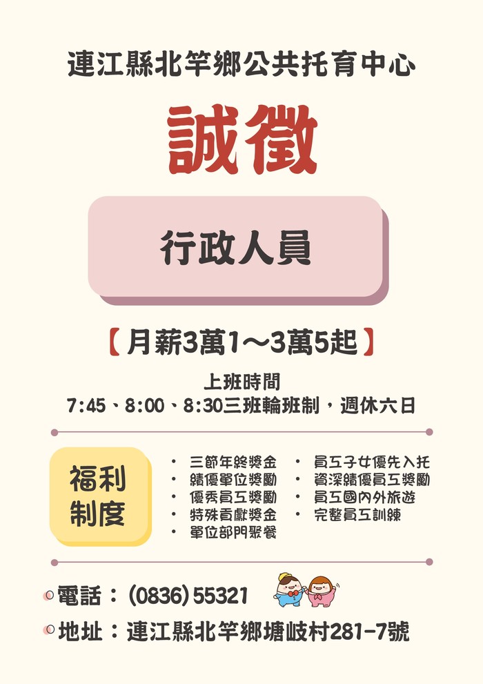 連江縣北竿鄉公共公共托育中心誠徵行政人員