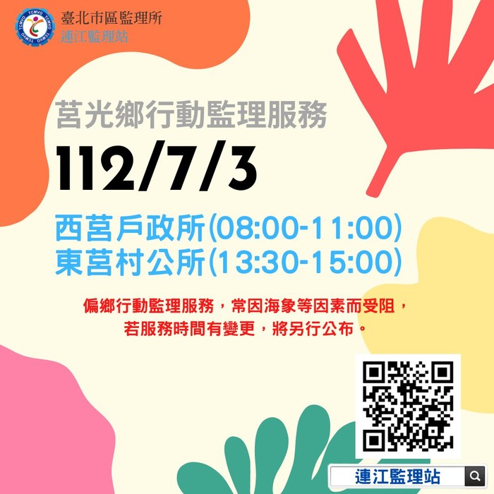 偏鄉行動監理服務,常因海象和交通等因素而受阻,服務時間如有變更,另行公布。