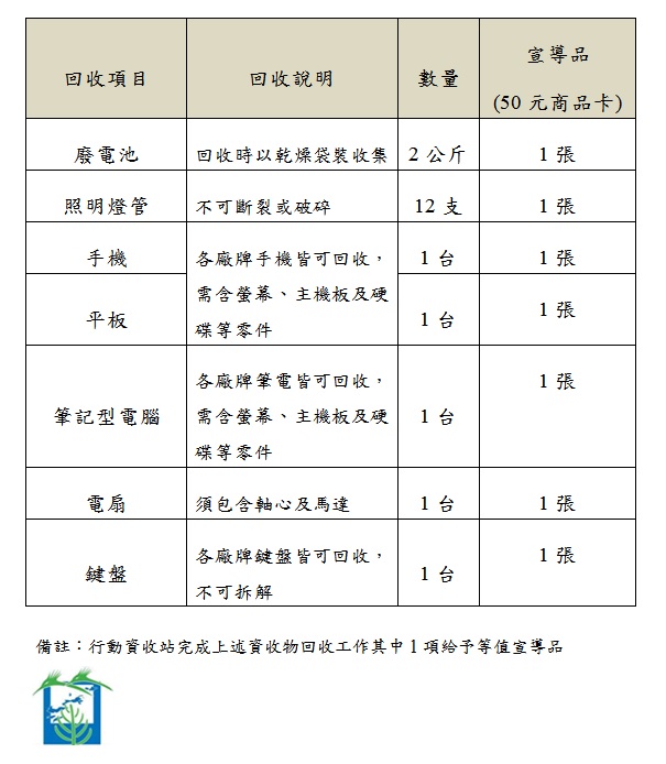環資局為加強推廣基層資源回收、共創循環經濟效益,委託技佳工程科技公司人員辦理北竿、東莒及東引三島行動資收站宣導活動,行動資收站活動分2階段進行,第一階段為行動資收做環保,民眾攜帶重點項目資收物回收工作(廢電池、照明燈管、手機、平板、筆記型電腦、電扇或鍵盤),符合下表其中一項重點項目資收物回收工作給予等值宣導品(每人每場限領1次宣導品) 或提供家中乾淨且完整的紙袋或任意型式的提袋30個,符合第一階段回收工作之民眾,方可進行第二階段互動式小遊戲「『鐵』定好玩垃圾分三類等您來挑戰,希望藉著不斷的宣導,讓民眾養成良好的環保觀念,為我們居住的環境盡一份力量。