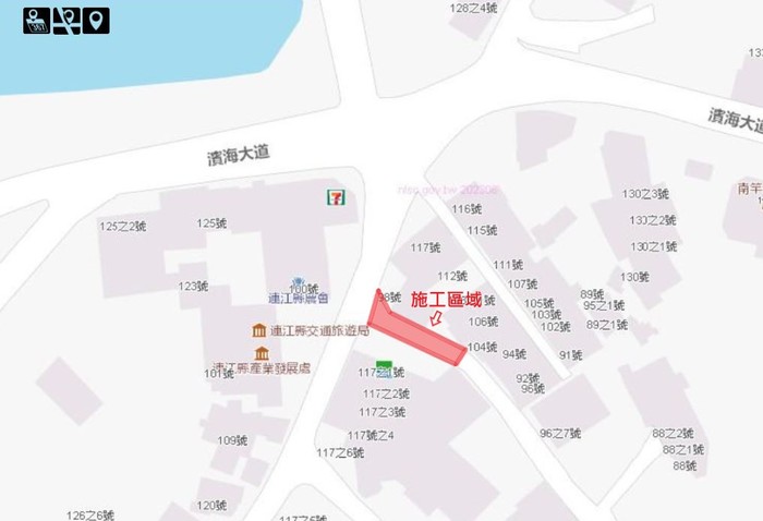 本處為配合環境資源局「連江縣南竿鄉排水系統改善工程(第三標)」於清水村之排水溝改善工程,預定於112年7月8日於清水產發處對面巷道內進行寬頻管道遷移工程,施工期間將影響車輛進出,造成不便,敬請見諒。