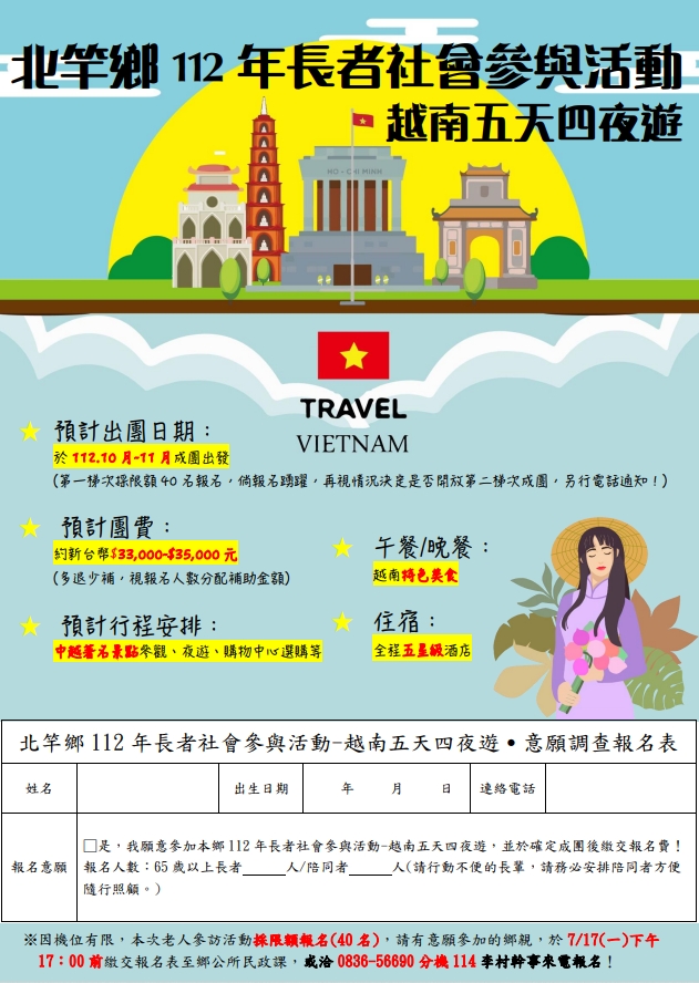 北竿鄉公所規劃於112年10月~11月間舉行本鄉「112年長者社會參與活動-越南五天四夜遊」