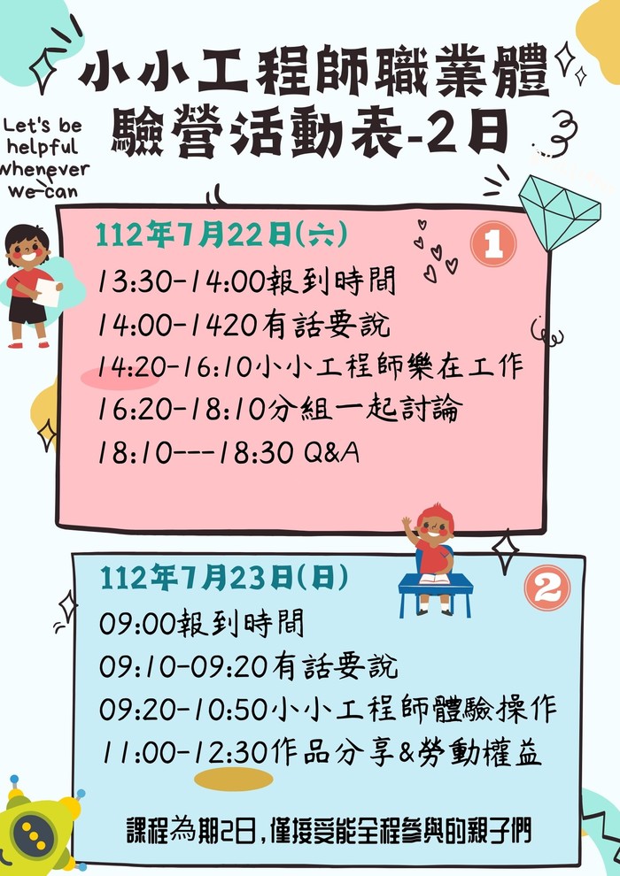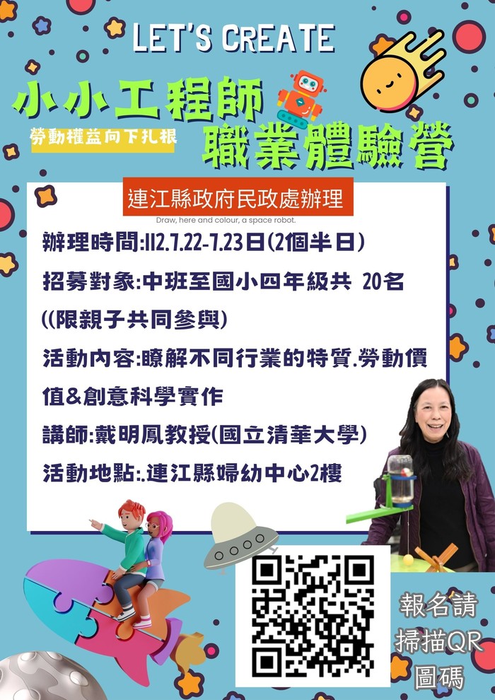 小小職業體驗第3場-小小工程師職業體驗 --閱讀人次 : 1014 連江縣政府民政處辦理112年度小小職業體驗活動第3場次-小小工程師職業體驗營報名資訊: