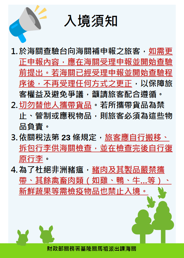 入境旅客如對攜帶之行李物品有任何疑義時,請於通關前向海關關員洽詢。