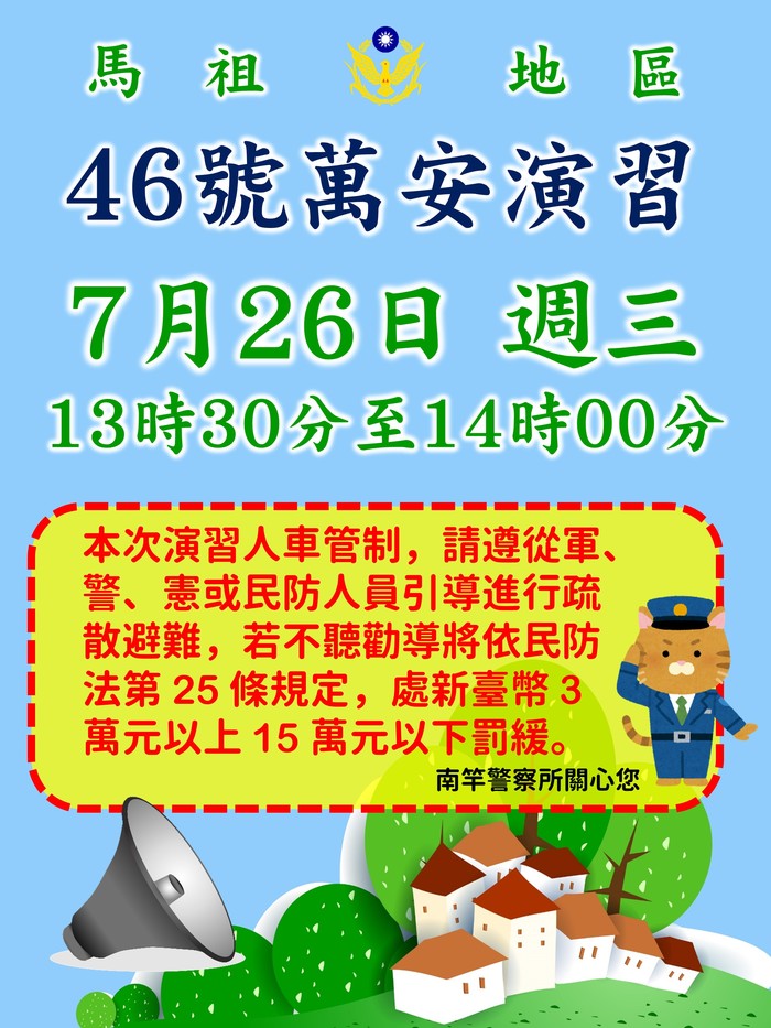 【南竿警察所】萬安46號演習注意事項 --閱讀人次 : 975