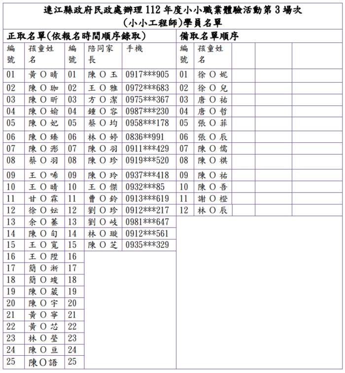感謝親子們報名本活動,正取及備取名單依【報名時間順序】及【符合招募對象年齡】排列。