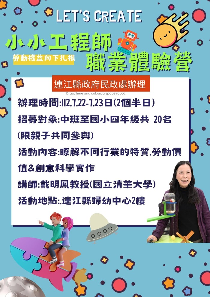 二、為讓更多孩童參與小小職業營,本場次名額增加至25名,請公告正取的小小工程師們務必全程參與,若因故無法參加,請務必7/20日前來電取消(0836-22381分機6115)。