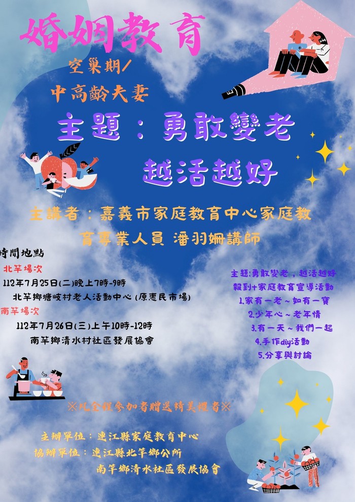 一、活動主題: 中高齡婚姻教育-勇敢變老,越活越好(第4-5場次)