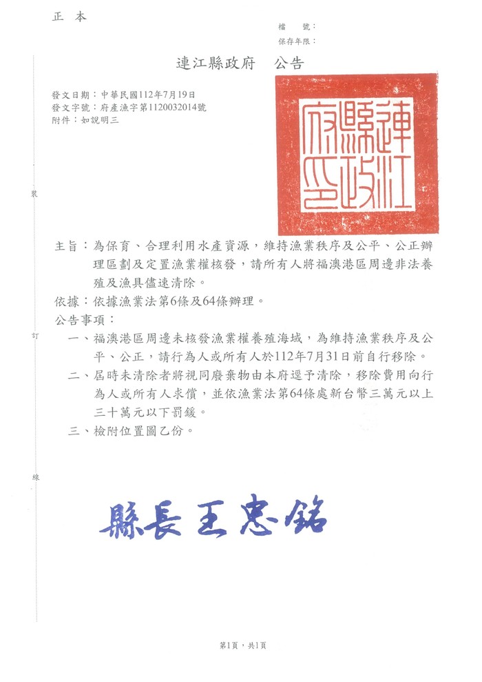 福澳港區周邊非法養殖及漁具清除公告