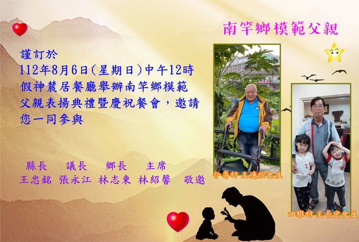 為慶祝112年父親節,南竿鄉公所訂於8月6日(星期日)中午12時假神辳居餐廳舉辦南竿鄉模範父親表揚典禮暨慶祝餐會活動,誠摯邀請設籍在南竿鄉的爸爸們一同參加。