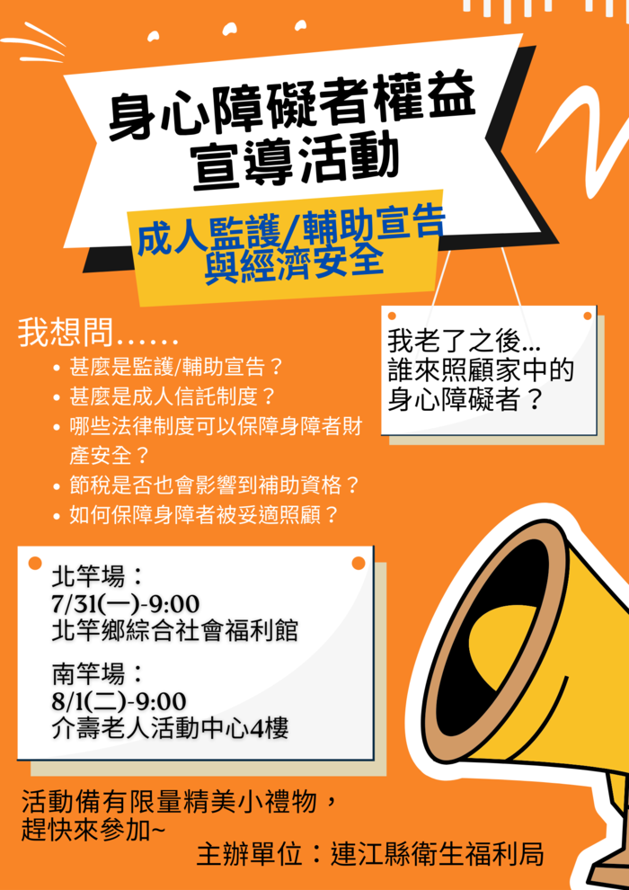 連江縣112年度身心障礙者權益宣導活動 --閱讀人次 : 710 連江縣112年度-身心障礙者監護輔助宣告宣導暨講習計畫