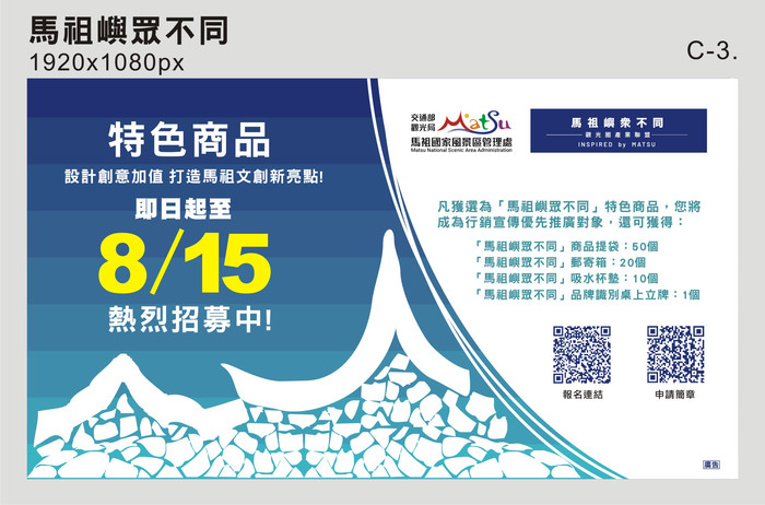 設計創意加值,打造馬祖特色商品,歡迎踴躍參與!讓我們共同品牌行銷四鄉五島,拓展多元商機,將馬祖獨特魅力帶往世界!