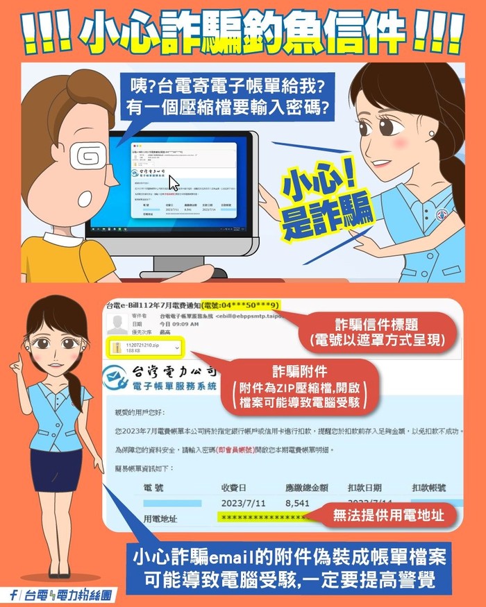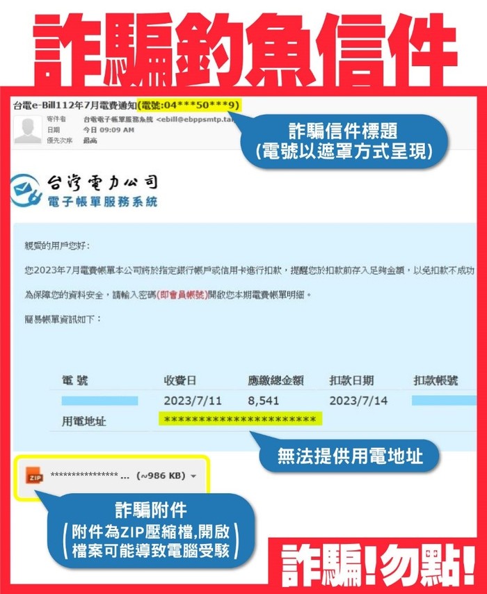 詐騙手法推陳出新,假借【台灣電力公司】電子帳單系統名義,發送提醒用戶存入金額以扣繳電費之「詐騙」電子郵件,