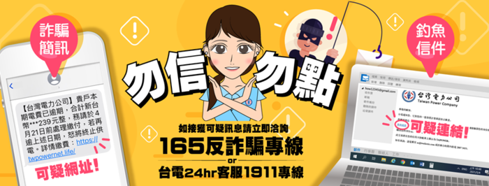 請民眾務必提高警覺,如接獲任何可疑電子郵件,請立即向165反詐騙專線或本公司24小時客服專線1911詢問,以免受騙!