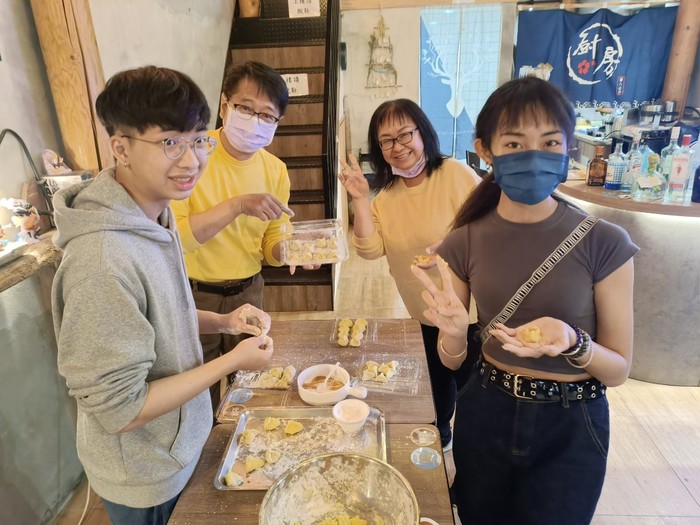 一邊享用自己做的黃金餃點心,透過指導員的引導,大家分享今日的感受和心得,再次感受人與聚落、人與環境的關係,引發學員的反思和策略發想,以達推動永續旅遊的目標。