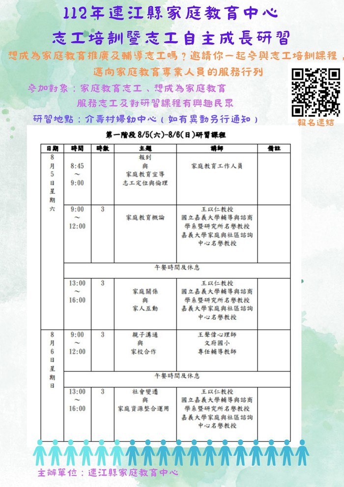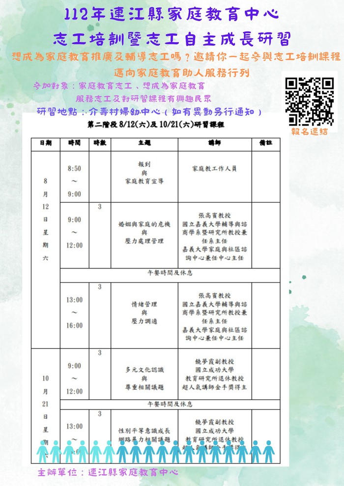家庭教育中心志工培訓暨志工自主成長研習 --閱讀人次 : 940 112年連江縣家庭教育中心召募新志工培訓暨志工自主成長研習