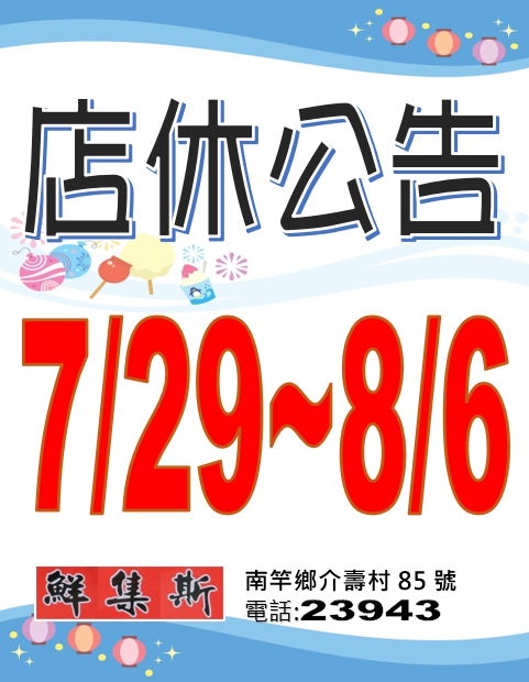 【鮮集斯】7月29日~8月6日店休公告
