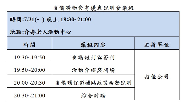 環資局為讓民眾更瞭解自備環保購物袋有優惠服務,於7/31晚間19:30介壽老人活動中心辦理一場說明會,因場地有限開放民眾報名參加,限額30名,會後備有精美宣導品,歡迎鄉親踴躍報名。