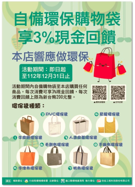 7/31自備購物袋購物優惠3%說明會 --閱讀人次 : 1662 環資局為加強推廣購物自備購物袋,減少一次性購物袋及塑膠袋使用,鼓勵商家、連鎖便利超商提供折扣給自備環保袋之消費者,希望鄉親配合購物自備購物袋,提供自備環保購物袋有優惠服務,憑消費發票折抵採購物品總價3%之消費額度,以悠遊卡點數回饋方式辦理,每次消費回饋上限不得超過200元,即日起至112年12月31日止,規劃15萬點數兌換儲值悠遊卡金額數量有限換完為止。