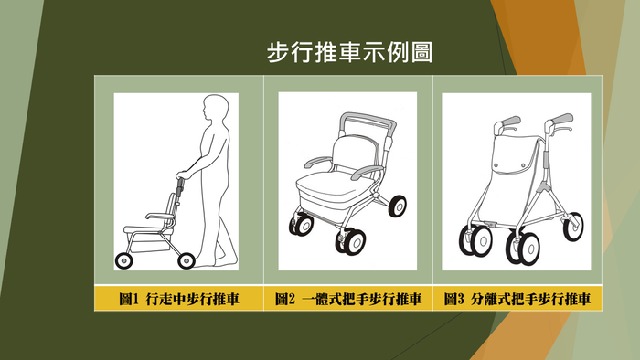 我國老年人口(65歲以上)佔總人口比率,自107年已跨越14%,正式邁向「高齡社會」。為維護年長者或身心障礙者步行時的品質及尊嚴,步行推車輔具可有效協助步行提供必要的支撐,以保持使用者的穩定性及平衡性。當用於步行時,步行推車不會承載使用者之全部體重,同時,步行推車可配備椅座及購物袋等配件,也可將椅座當成具煞車器的休息椅座,提供年長者或身心障礙者於疲憊時休息使用。