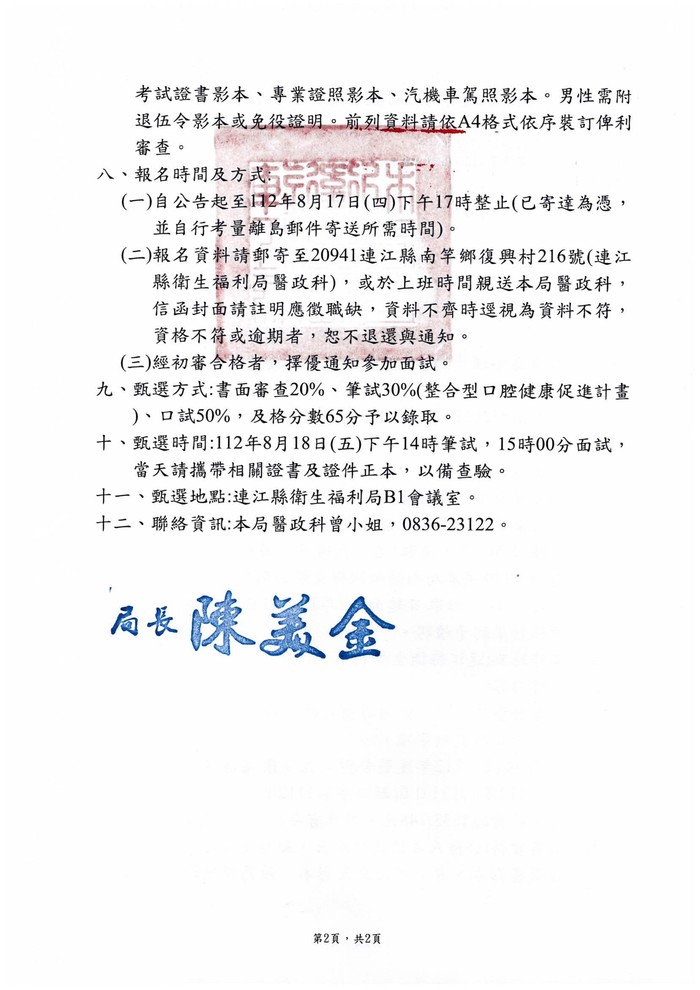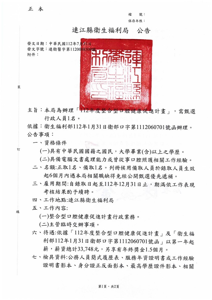 衛福局徵選112年度整合型口腔健康促進計畫行政人員1名