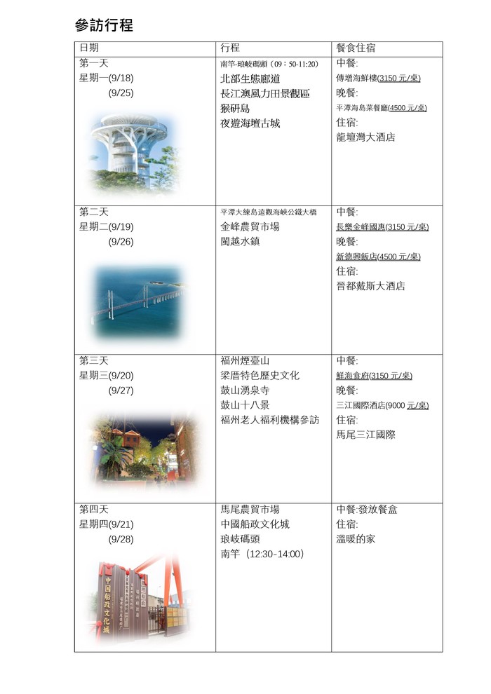 (一) 本行程為團進團出,若自行脫隊或自行前往者依交通部觀光局相關規定不予以退費,且若中途脫隊者,往後年度將不得再參加社會福利相關參訪活動。